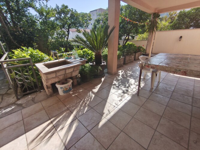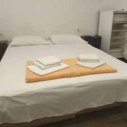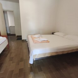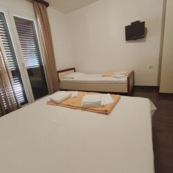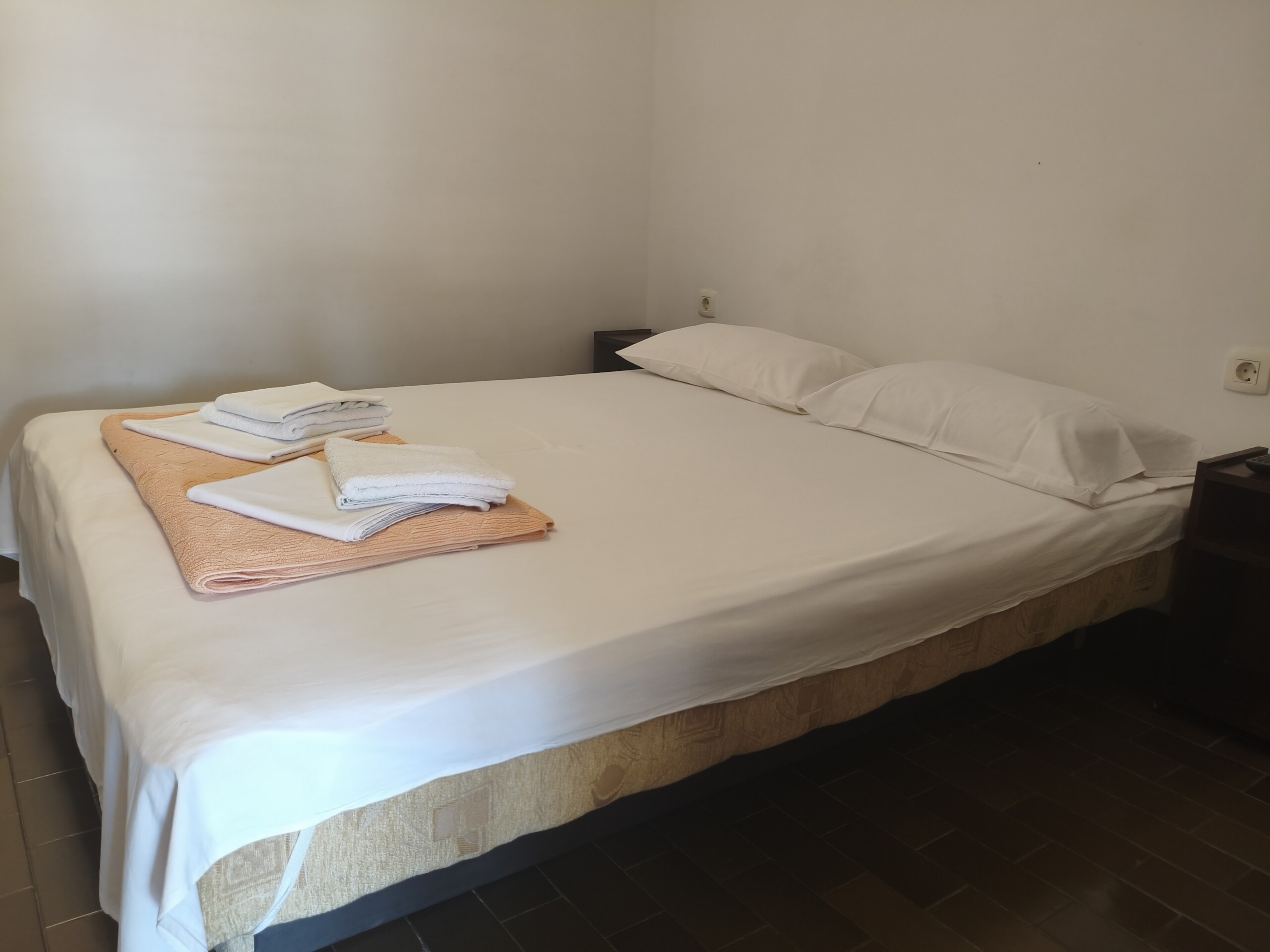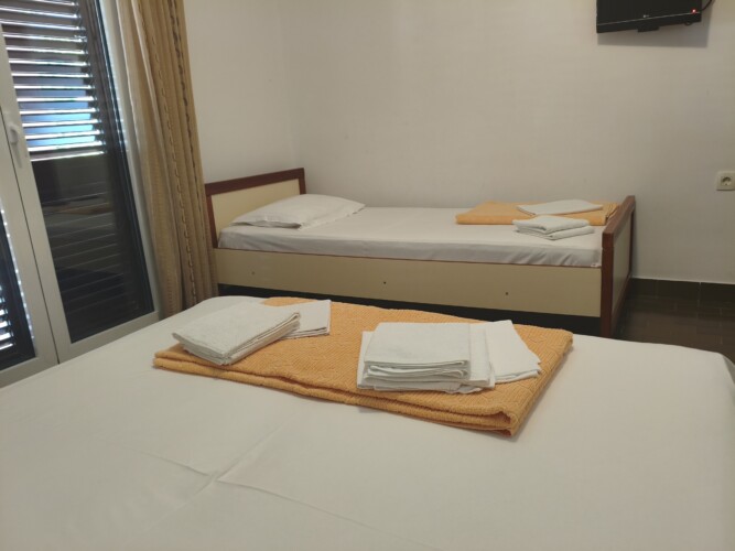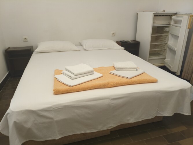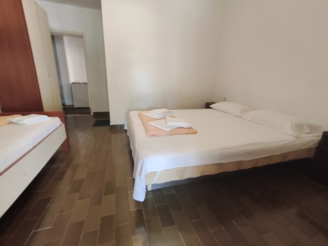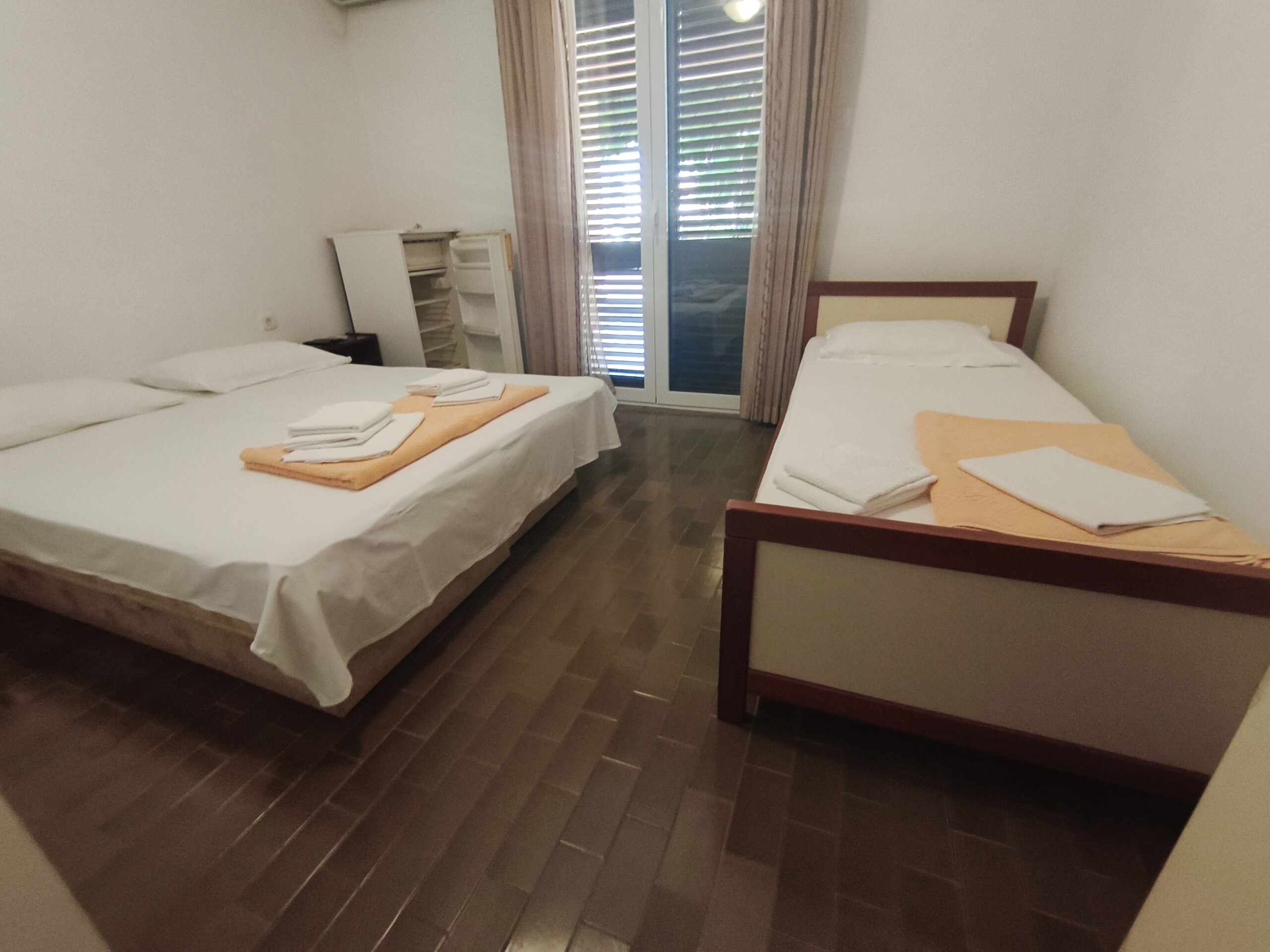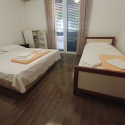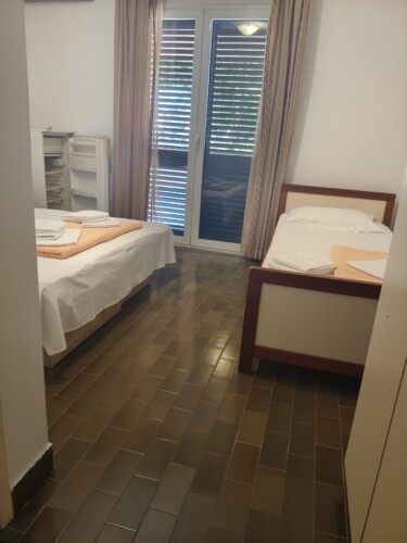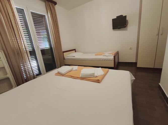 Trokrevetna soba u prizemlju ,ima kupatilo u sobi,klimu,frižider,tv,wifi,izlaz iz sobe na veliku zajedničku terasu.Gosti na terasi mogu da koriste česmu,rešo i posuđe za kafu i jednostavnija jela(jaja,supa i sl).